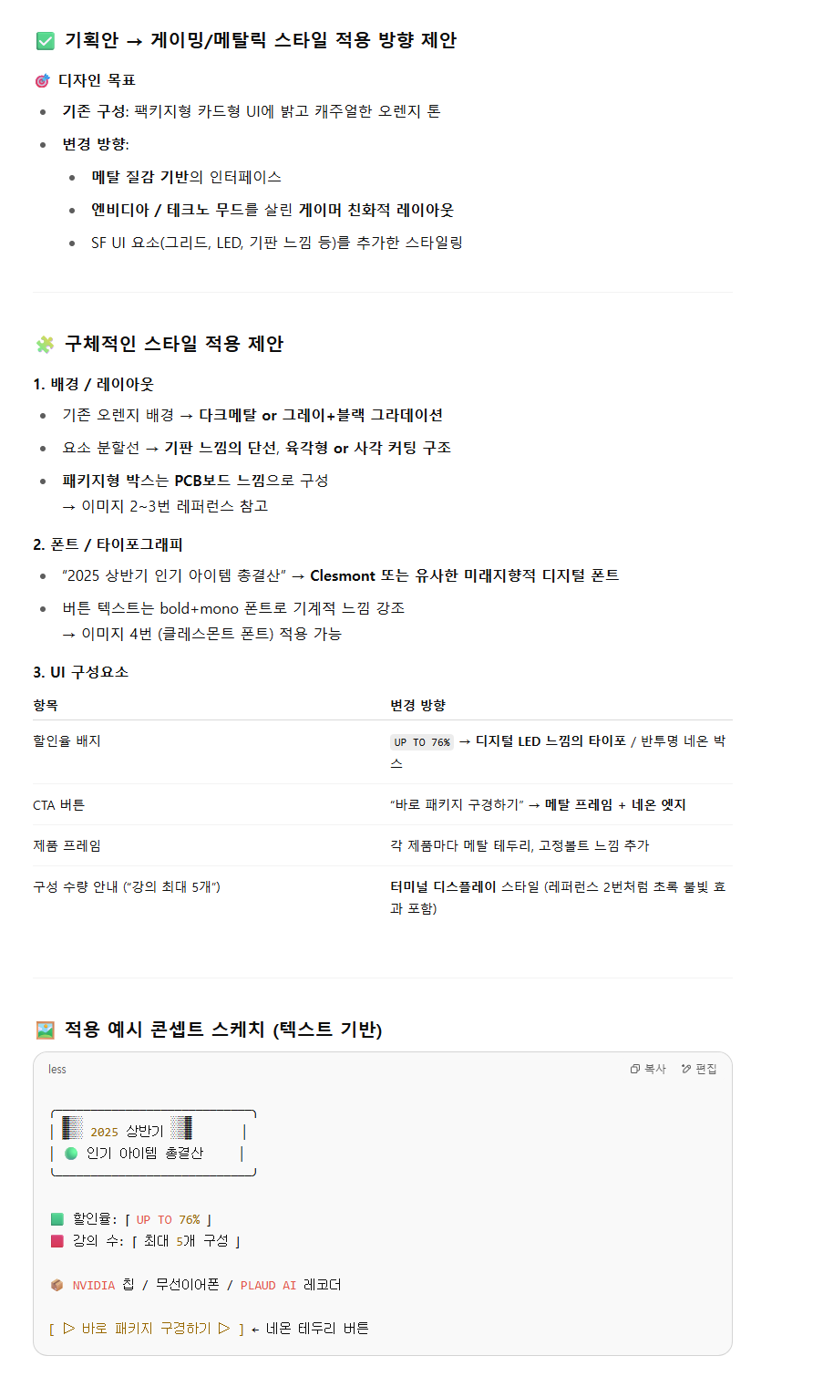 클라이언트에게 중구난방 받은 레퍼런스, 키워드, 요청 사항을 넣으면 GPT가 디자인 무드보드 설명문이나 스타일 가이드 요약 텍스트를 생성해줍니다. 기획안으로 완벽하게 주는 클라이언트가 잘 없기 때문에 한번 정리해서 피그마에 따로 정리를 해두는게 편하더라구요.