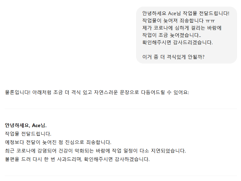 가끔 클라이언트와 소통을 하다보면 곤란한 요구사항에 정중한 답변이 필요한 경우가 있습니다. 뭐 예를 들어, 입금 처리가 안되었다던가 견적 조율 요청이 있을 때 같은 경우죠.