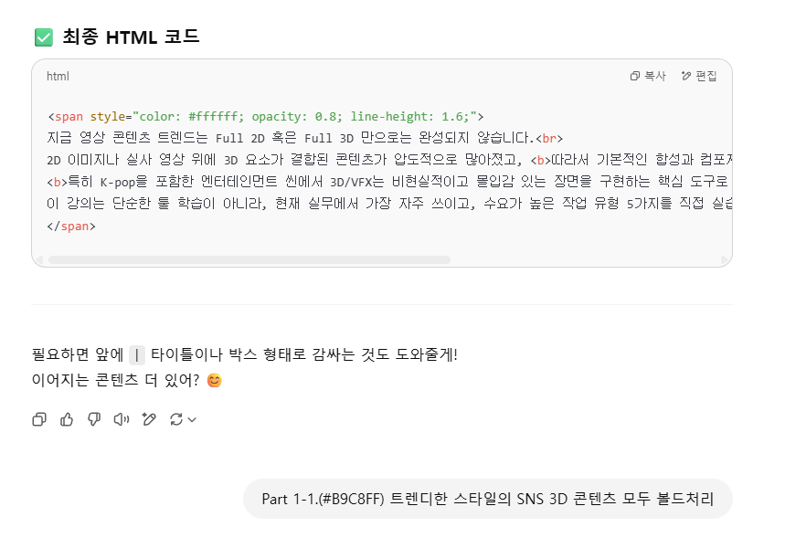 디자인을 웹으로 옮기다보면 <br> 줄바꿈이 겹치거나 스타일이 깨져서 구현이 안되는 경우가 있습니다. 이럴 땐 그대로 챗 GPT에 복사 붙여넣기 한 후 shift+enter 기능으로 띄워쓰기를 해 준 뒤 GPT에게