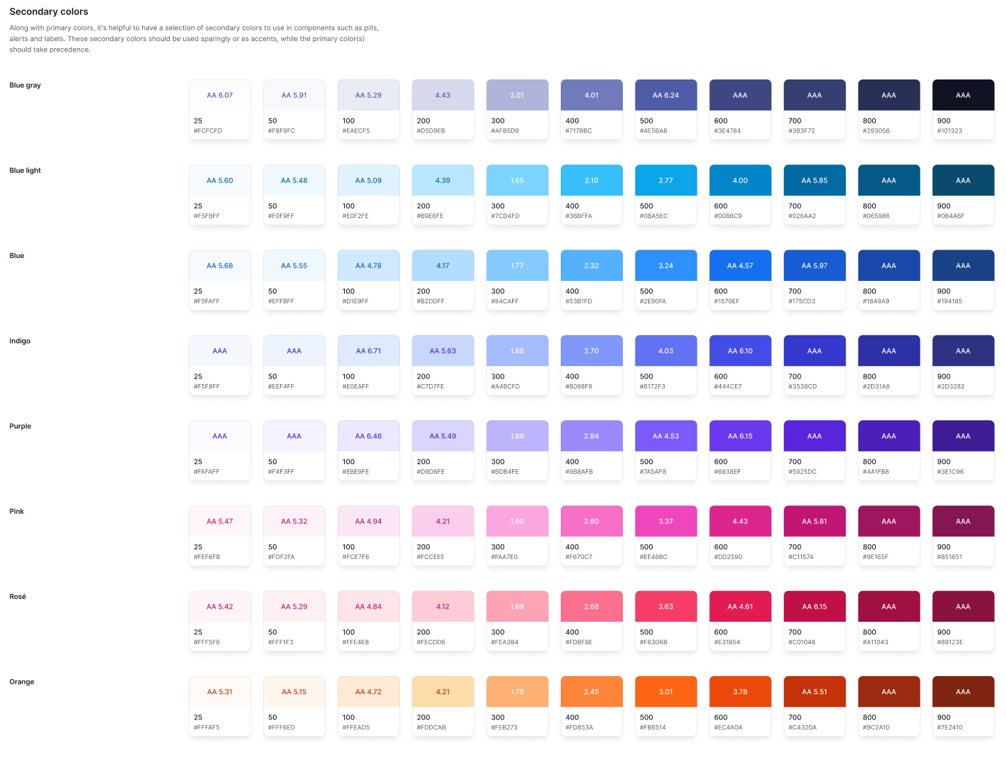 색상은 브랜드 인상과 사용자 경험에 직접적으로 영향을 주는 요소입니다. 기본적으로 아래 3가지 카테고리로 나누어 정리하는 것이 좋습니다.