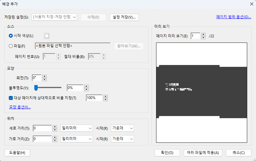 • 도구 > PDF 편집 > 자세히 > 배경 > 추가