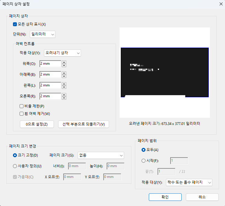 도구 > 인쇄물 제작 > 페이지 상자 설정
