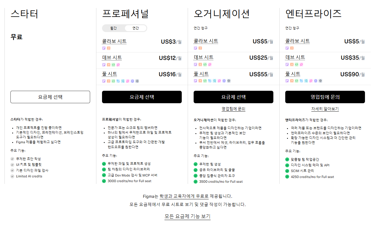 피그마는 무료로 시작할 수 있지만, 학생 계정은 프로급 기능까지 무료로 제공한다는 점에서 꼭 챙기시길 권장드립니다. 프리랜서 디자이너라면 클라이언트와의 협업 효율을 높이기 위해서라도 피그마 무료 계정부터 시작해보시길 권장드립니다!