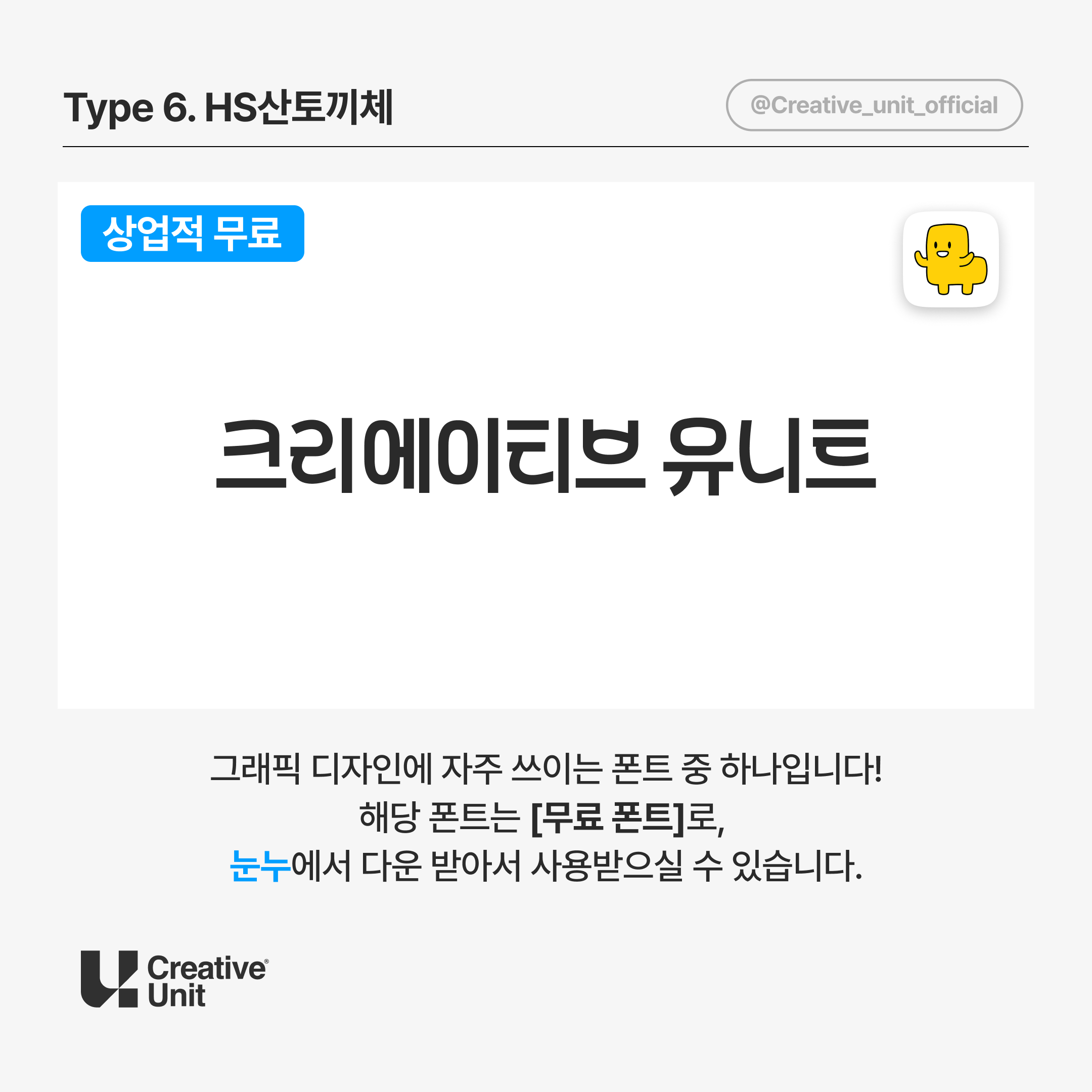 HS 산토끼체는 재미있고 활기찬 분위기를 연출하고자 할 때 탁월한 선택입니다. 특정 캐릭터 디자인이나 아기자기한 브랜딩 요소와 함께 사용하면 자연스럽고 친근한 인상을 줄 수 있습니다. 특히 가벼운 톤의 콘텐츠에 적합합니다.
