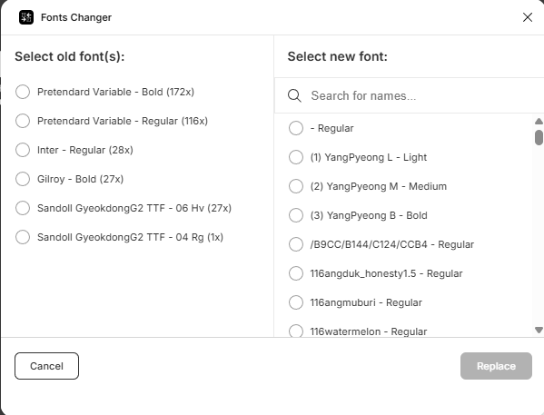 선택한 영역(또는 전체 페이지)의 텍스트 폰트를 한 번에 변경해주는 피그마 플러그인입니다.