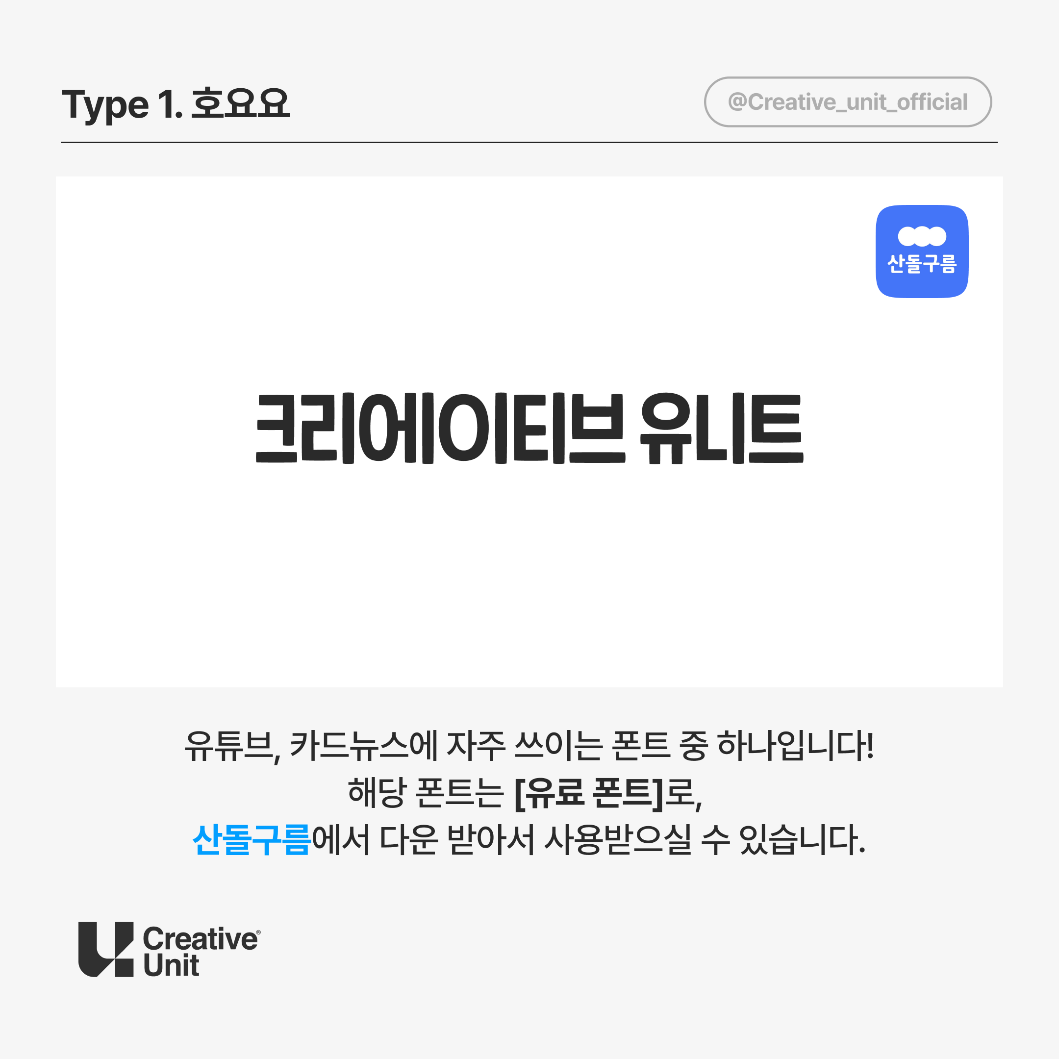 호요요 폰트는 깔끔하고 세련된 인상을 주는 폰트로, 주로 유튜브 썸네일이나 카드 뉴스에 많이 사용됩니다. 폰트 자체가 둥글고 부드러운 느낌을 가지고 있어 다양한 디자인 요소와 자연스럽게 어우러집니다. 특히 이 폰트는 가독성이 뛰어나기 때문에 짧은 문구부터 긴 텍스트까지 모두 소화할 수 있습니다. 해당 폰트는 유료 폰트이며, 산돌구름에서 다운로드가 가능합니다. 상업적으로도 사용가능하며 다양한 프로젝트에 활용할 수 있습니다.