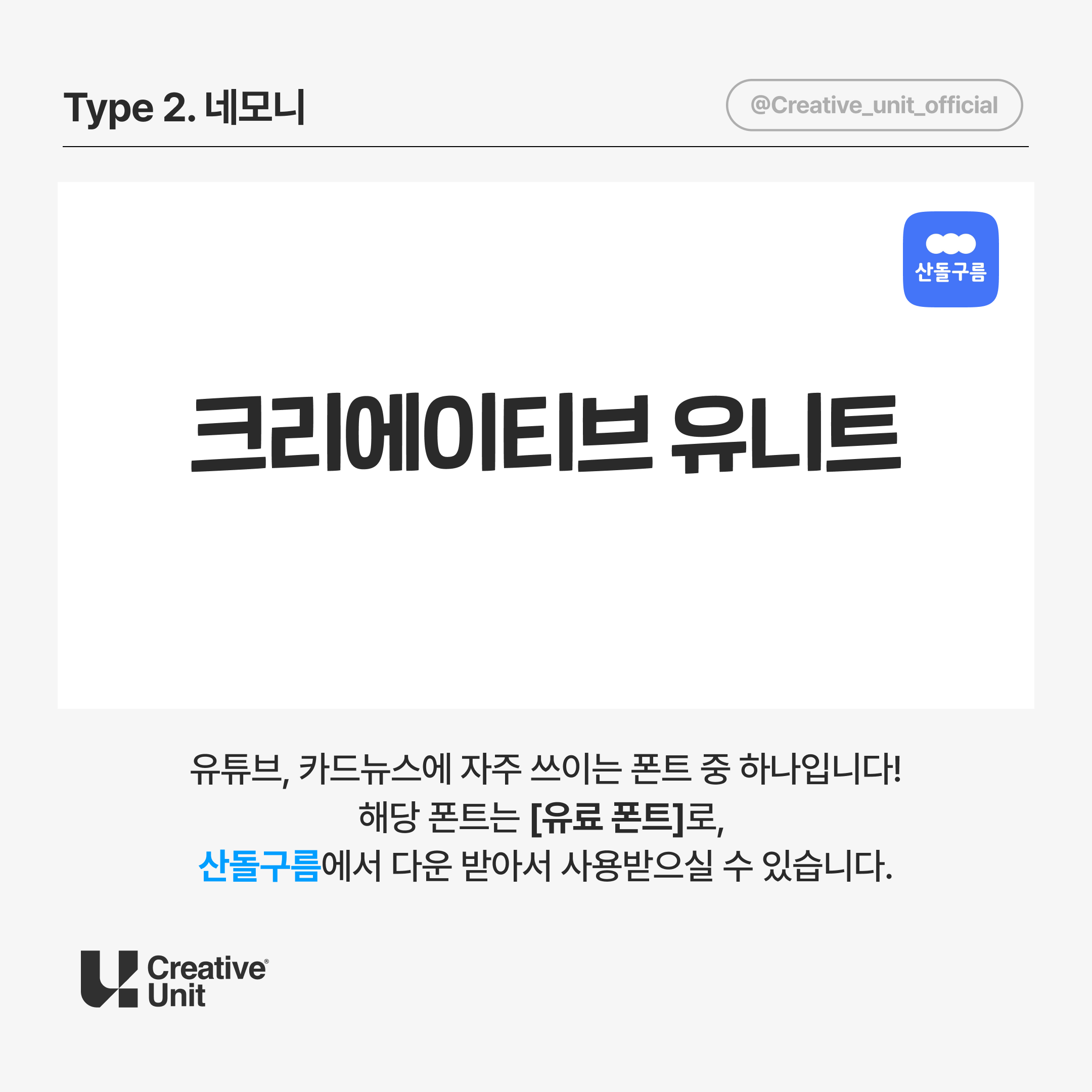 네모니 폰트는 강렬하면서도 부드러운 타이틀 폰트로 짧은 문구를 돋보이게 만들기 좋습니다. 이 폰트는 유튜브 콘텐츠나 카드 뉴스 같은 콘텐츠에서 많이 사용되며, 가독성이 높아 다양한 배경색 위에서도 잘 읽히는 장점이 있습니다. 또한, 각 글자의 모서리가 부드럽게 처리되어 있어 시각적으로 편안함을 주며, 독자의 시선을 자연스럽게 끌어들입니다. 산돌구름에서 다운로드 할 수 있으며, 유료폰트입니다.