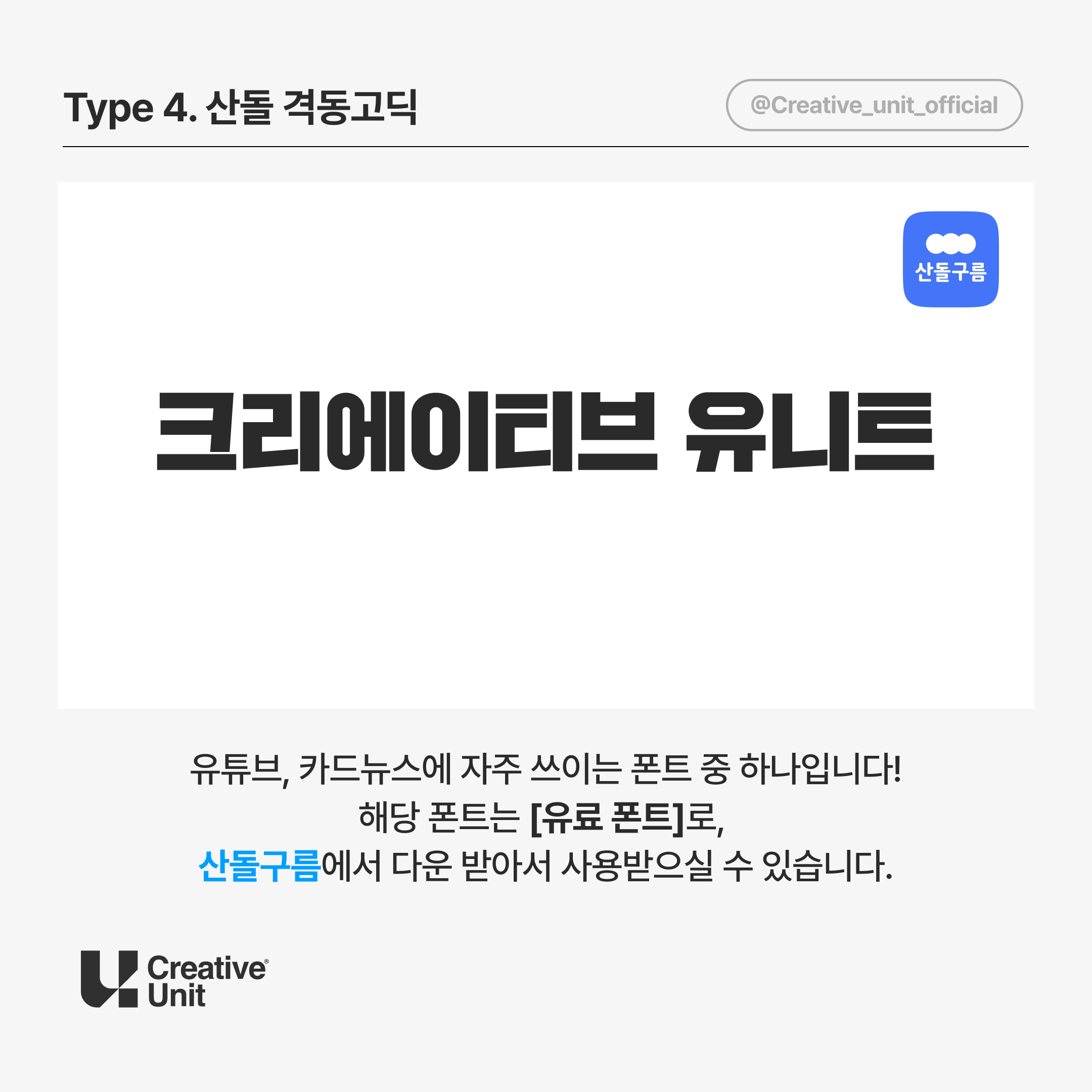 산돌 격동고딕 폰트는 비주얼 콘텐츠의 강렬한 메시지를 강조하는데 효과적입니다. 강한 이미지와 함께 사용하면 독자의 시선을 사로잡고, 강한 인상을 남길 수 있습니다. SNS 프로모션, 브랜드 이벤트 배너 등에서 이 폰트를 사용하면 콘텐츠의 주목도를 높일 수 있습니다.